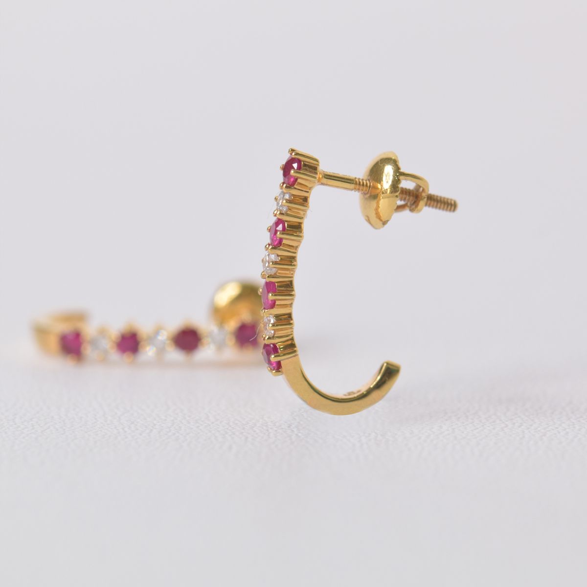 These stunning ruby and diamond hoop earrings are exquisitely crafted in 18k yellow gold. The J hoops are alternately studded with bright red rubies and sparkling diamonds for a captivating effect