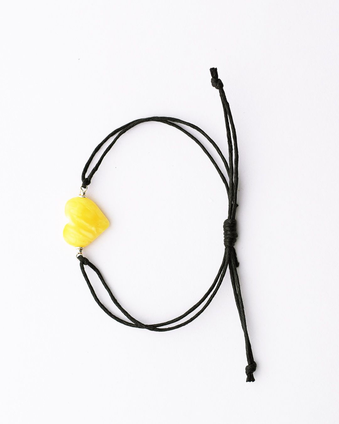 Heart amber bracelet with black adjustable thread for more comfort.