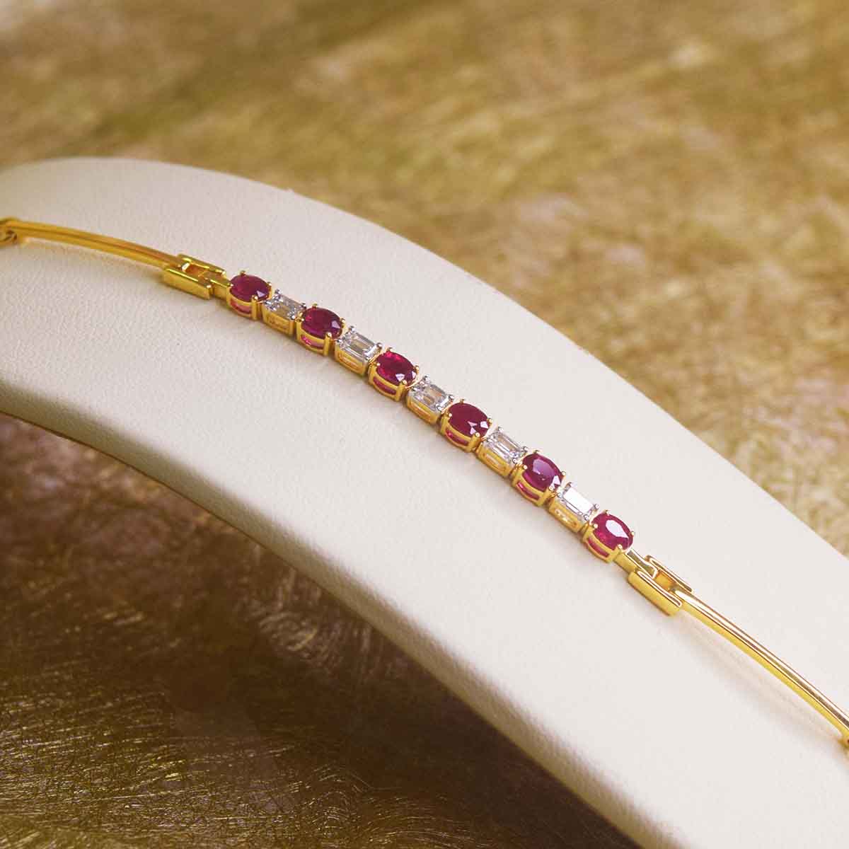 A Ruby and diamond bracelet handcrafted from 18k yellow gold is adjustable to fit most wrist. Oval Burmese Ruby alternates with emerald cut diamonds making it eye-catching. Match it with a ring to complete your look!