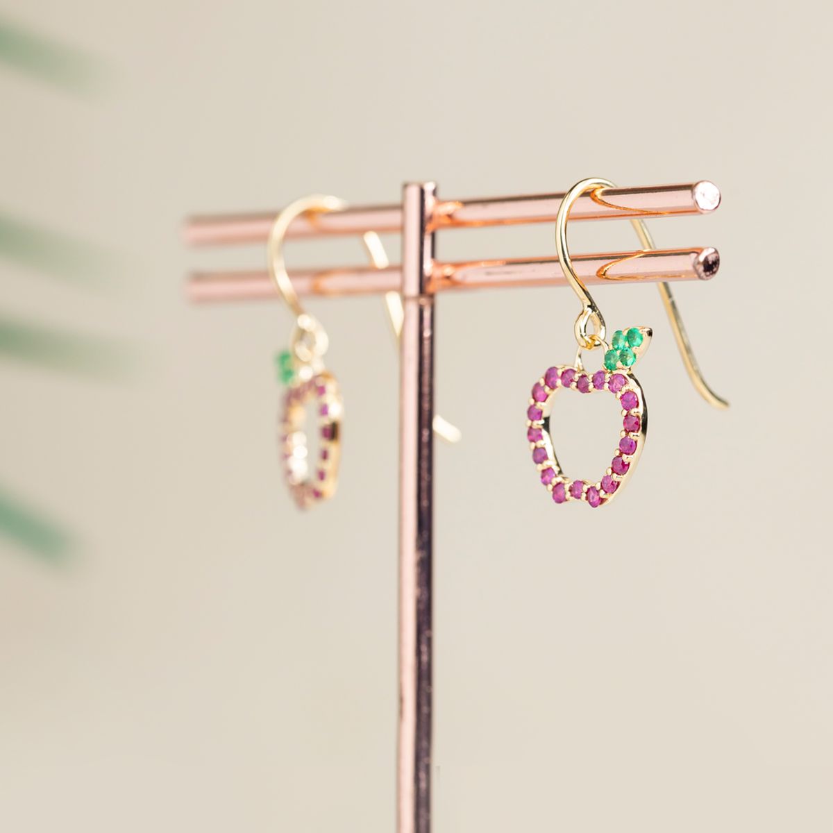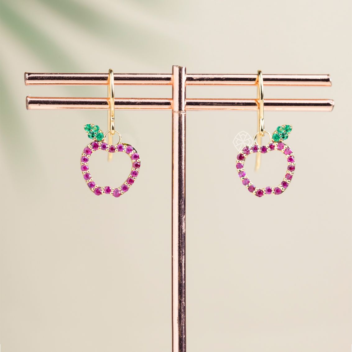 The cute apple-shaped earrings crafted in 18K yellow gold are adorned with Natural Burma Rubies and Natural emeralds. These earrings exude a delicate and graceful appeal, perfect for adding a touch of classic elegance to any outfit. The apple-shaped design is simple yet detailed, crafted with precision and skill to ensure a flawless finish.