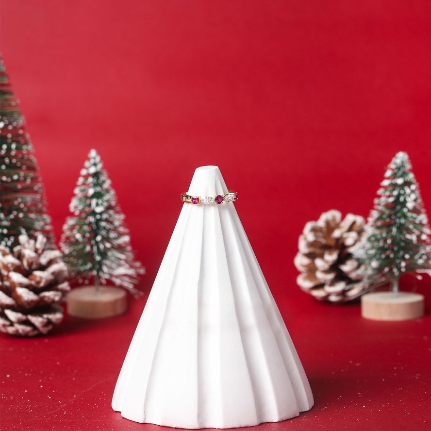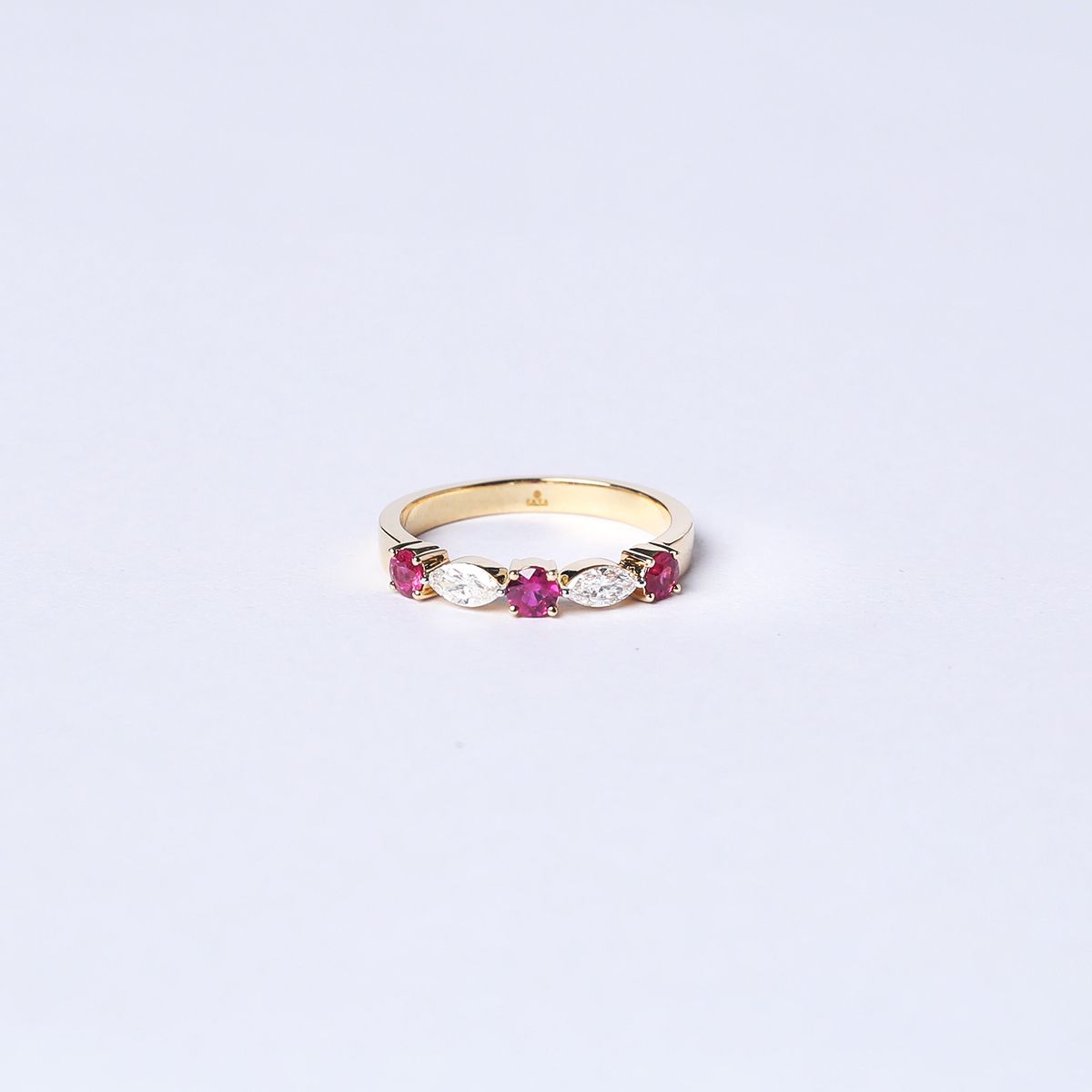 Round Burma Rubies with Marquise diamonds makes the Camille Ruby Diamond Ring super eye-catching.