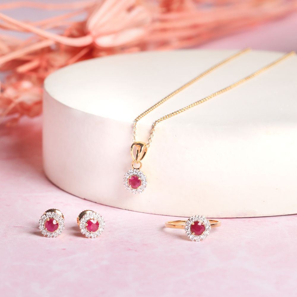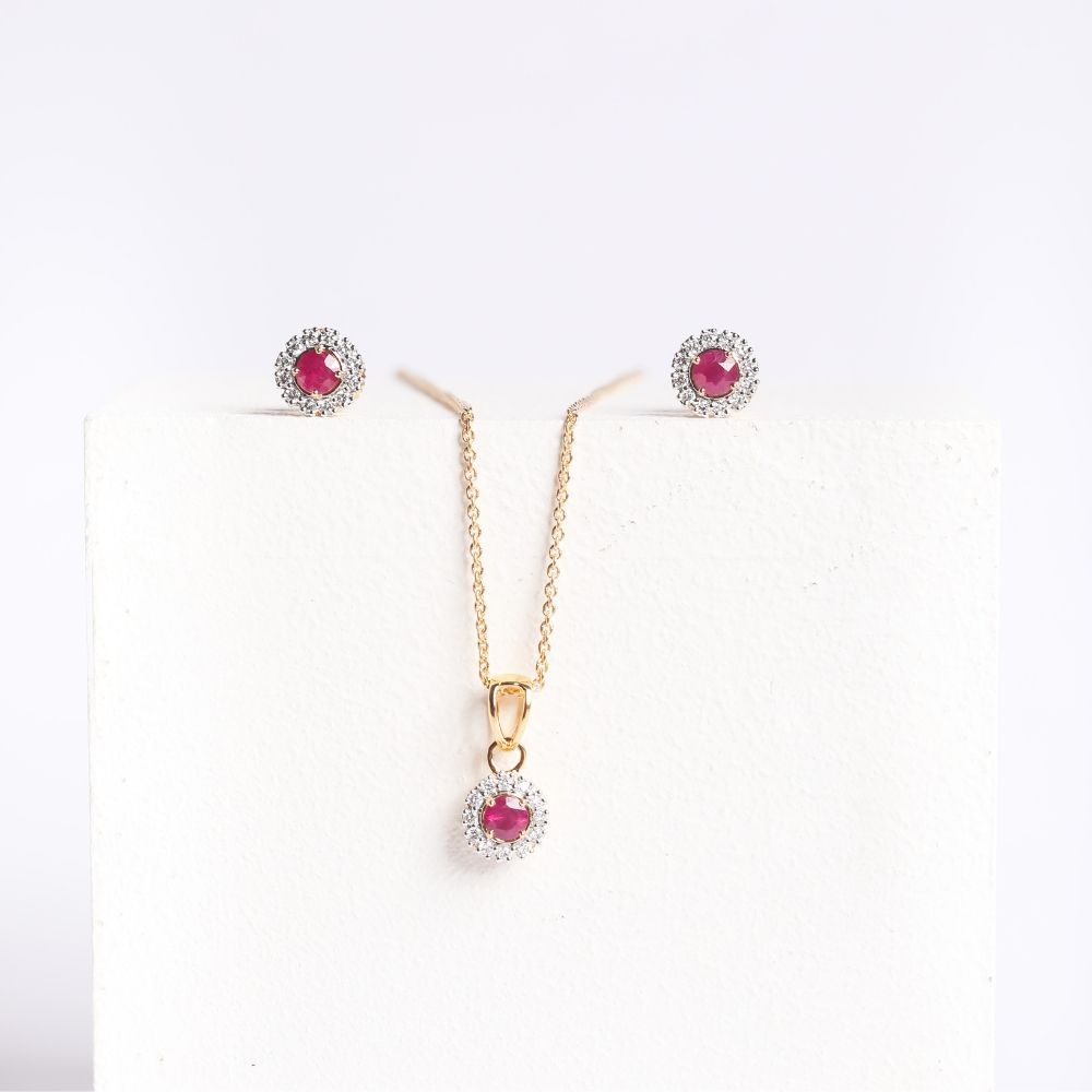Dia is a dainty ruby and diamonds set featuring a delicately designed earrings, a pendant and a ring. Add flair to your everyday look with this gorgeous set.
