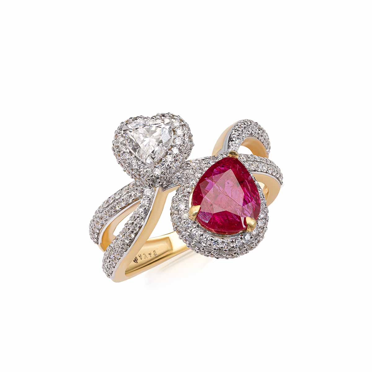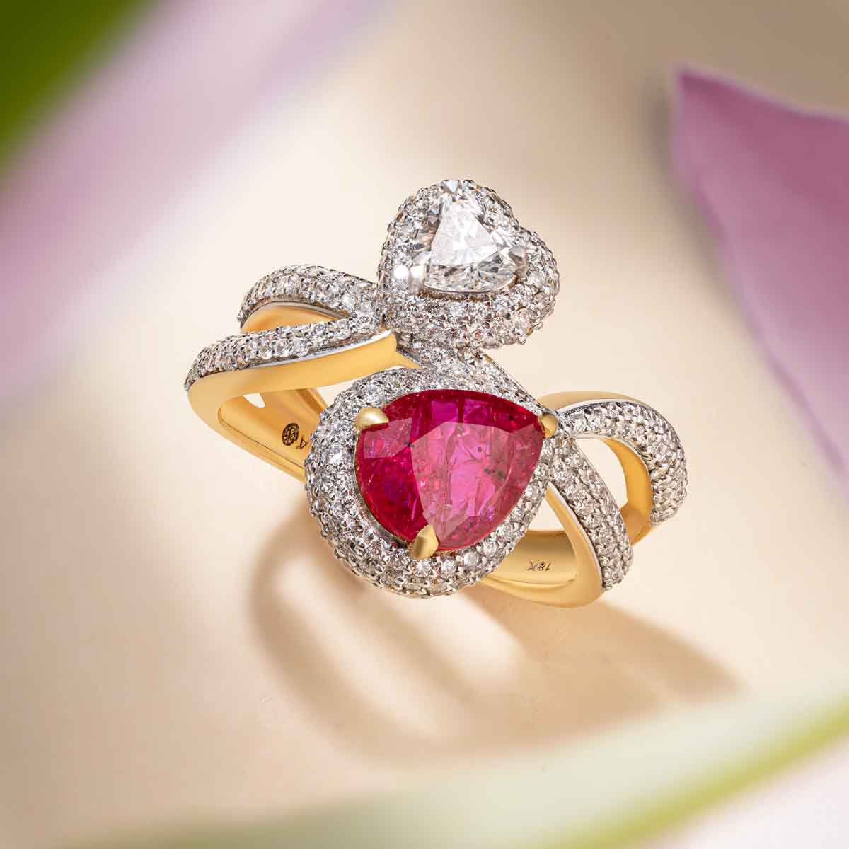 Indulge in the exquisite romance of our Elena Heart Pear Ring, where every facet gleams with love and luxury! Crafted meticulously in luminous 18k Yellow Gold, this ring is adorned with a Lab-Grown Diamond (LGD), carefully cut into a mesmerizing pear shape, symbolizing purity and eternal devotion and also a Natural Burma Ruby, adding a pop of vibrant color and passion to the design.