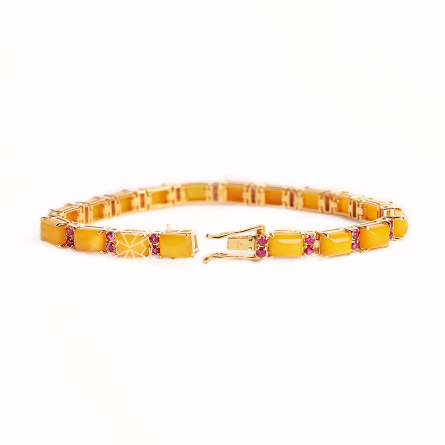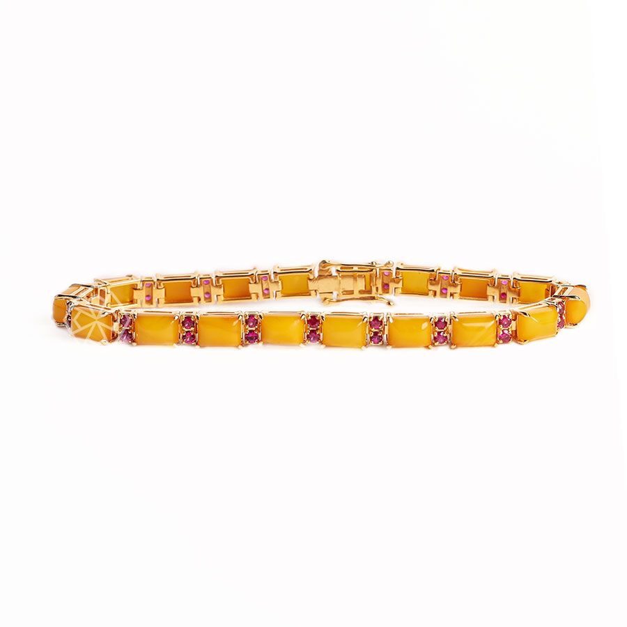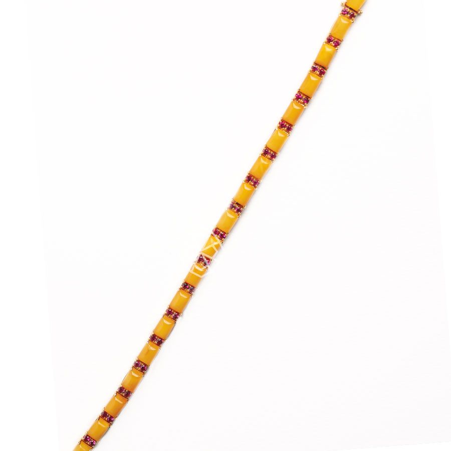 Slipping on and off easily, the Falak bracelet accented with elliptical Amber stones and sparkling Rubies does not need to be reserved for special occasions only. Intricate designs with fine detailing, this bracelet is designed to make you fall in love – with elegance and sparkle.