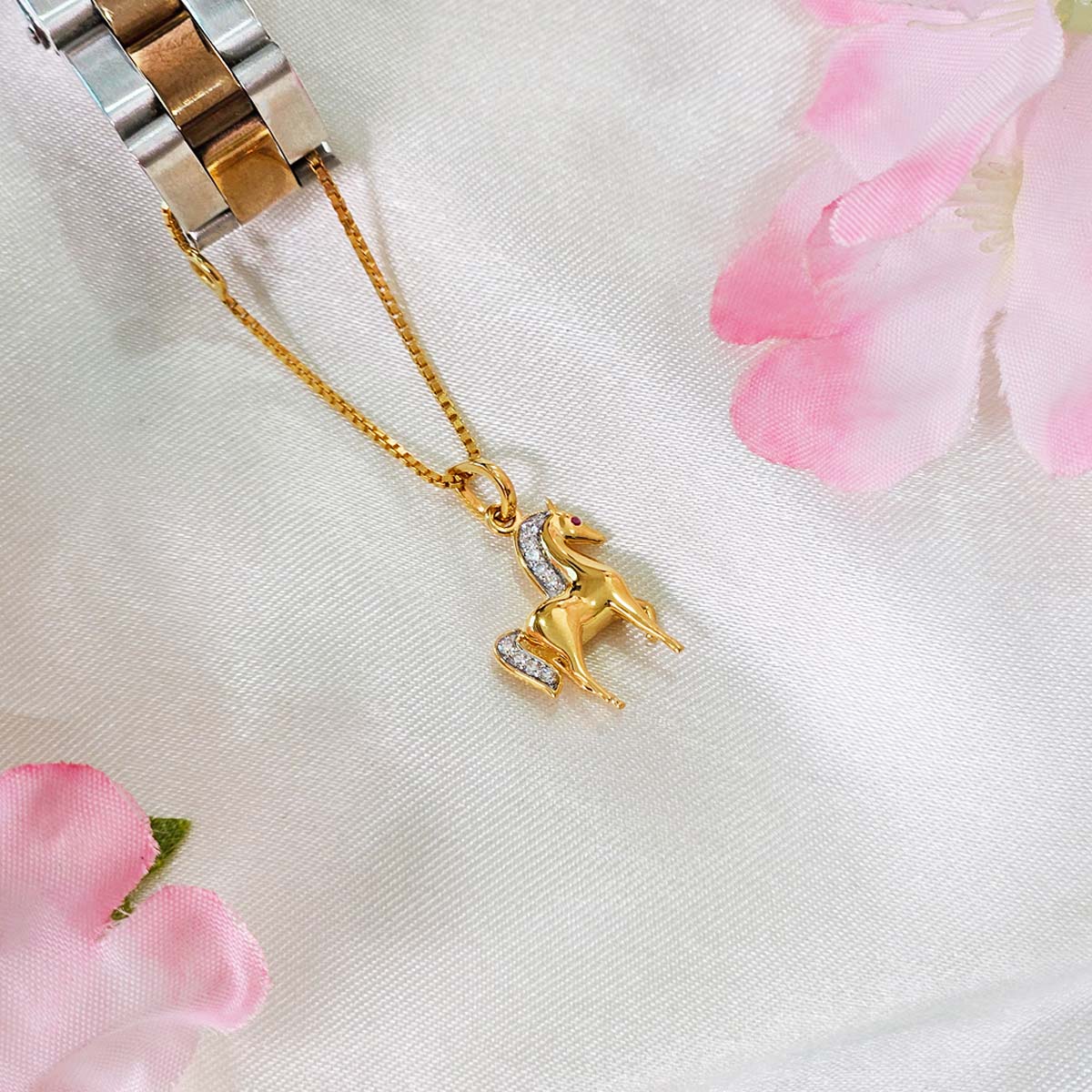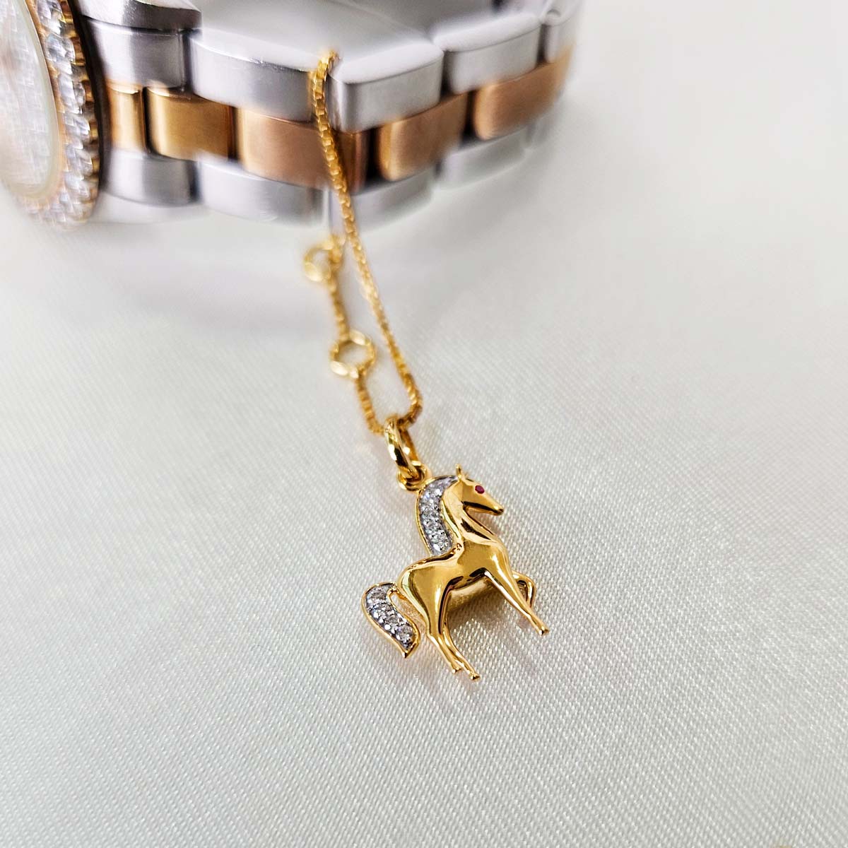 Adorned with a striking Burma Ruby and enhanced with dazzling lab-grown diamonds, it captures the essence of timeless beauty and grace. The delicate chain adds a touch of finesse, making it a perfect accessory for any occasion. Pair this enchanting Horse Watch Charm with your watch or a dainty bracelet for a touch of glamour. You can also experiment with layering by combining this charm with other delicate necklaces or pendants for a personalized and stylish statement. Embrace the beauty of this Horse Watch Charm as it embodies elegance, grace, and a timeless allure.