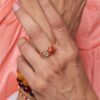 Our Jamila Diamond Gold Coral Ring is highlighted with flashes of sustainable diamond around the edges that shimmer and glow, adding to its aesthetic appeal. It features an orange-coloured gemstone, which is well framed in high-polished 18k gold.