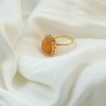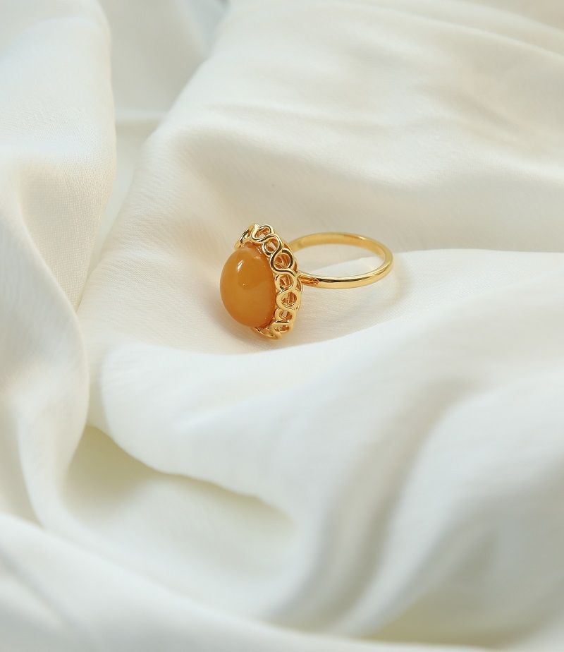 The pretty Marina ring features a stunning oval canary Amber, set within an ornate gold border. Add flair to your everyday look with this gorgeous ring.