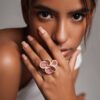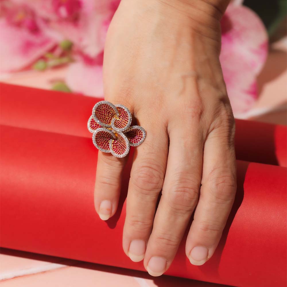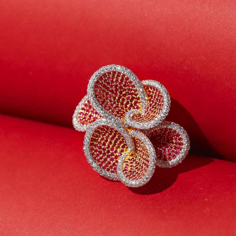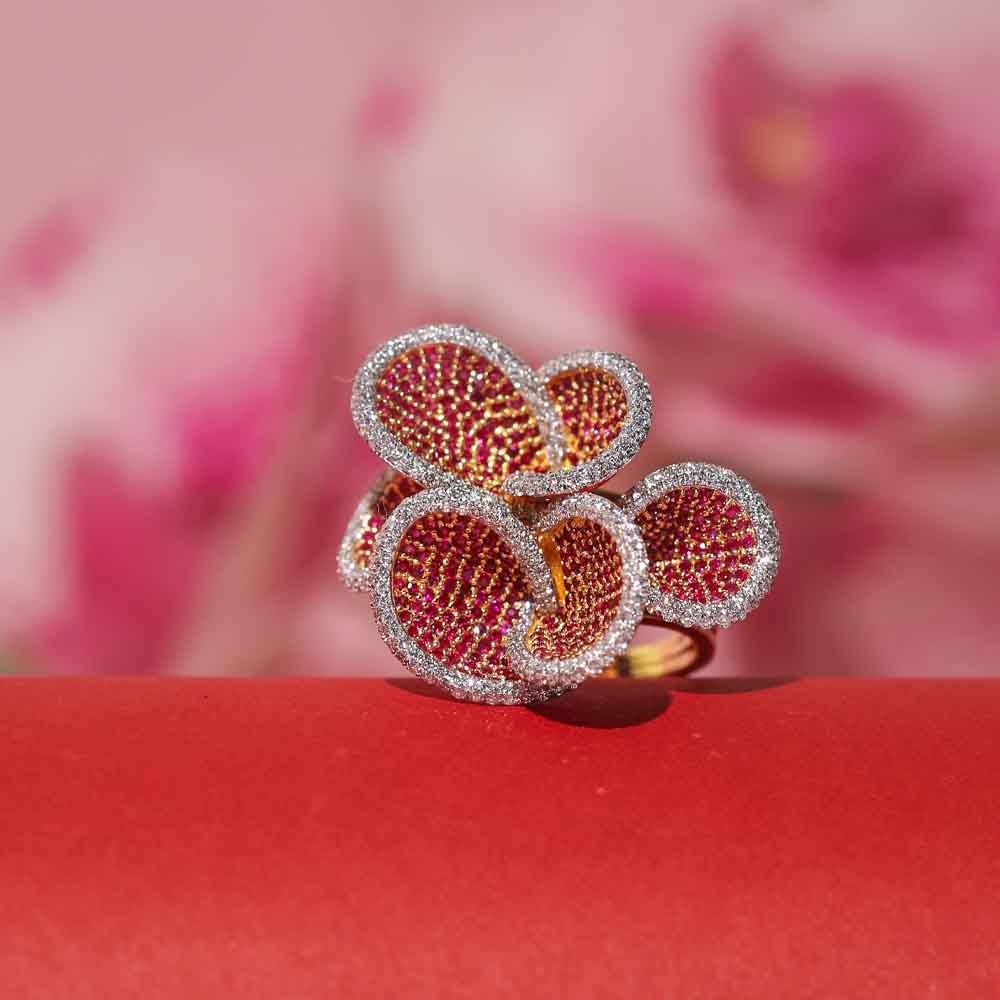 Iconic Beauty – The Naisha Flower Ring. Capturing the exquisite beauty of nature’s most captivating creation, a blooming flower set in pave Burma rubies and scintillating diamonds, breathes joy and dynamism into the design. Set in 14k yellow gold this floral design with golden petals in approx 10 ct shimmering precious gemstones bursting with life in full bloom was a joy to create. From the design to fabrication, it was a process that took almost 3 months to complete. The cluster is created with the best of 480 pcs of Burma rubies and 455 pcs of sparkling diamonds. The diamond acts as an in-between layer to bring focus to the Ruby to enhance the overall appeal of this ring. This ring is a testament to the delicate artistry behind its creation.