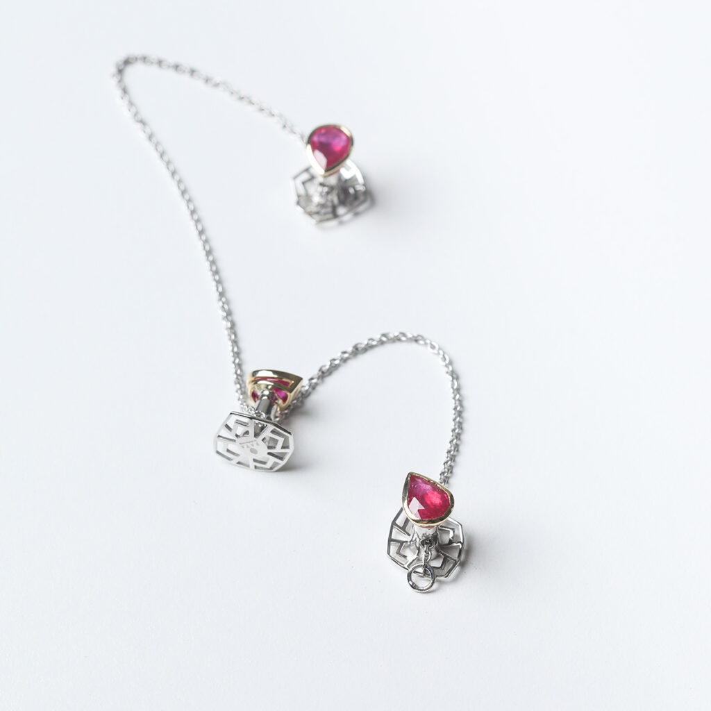 Teardrop Ruby buttons in a classic bezel setting fabricated in 18k gold on top with 925 silver in the stem and base, is a beauty to behold!