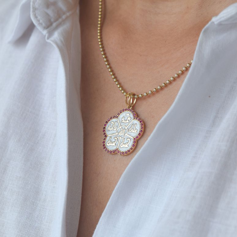 The Panjetani Pendant is an exceptionally stunning piece filled with the divine powers of 5 names of Panjetan Pak (AS). This piece is designed with the names of Panjetan making it a special pendant that one can wear at all times.