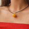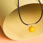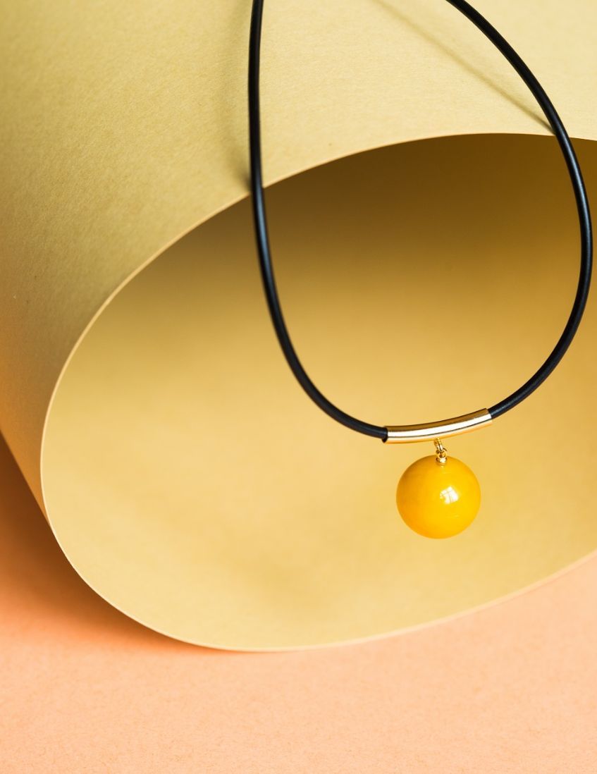 Rami is a stylish golden amber necklace. The round pure milky amber bead hanging from the gold plated silver pipe strikes a strong statement as it droops from the black leather string with a silver clasp.