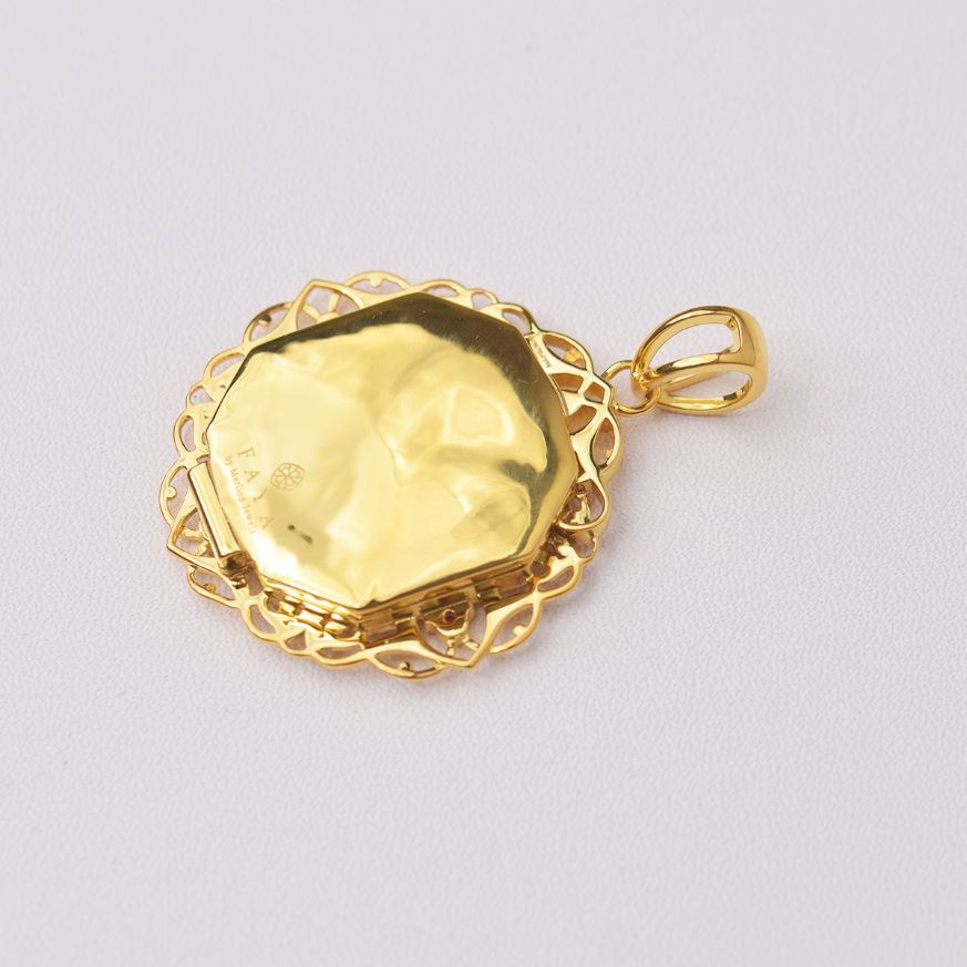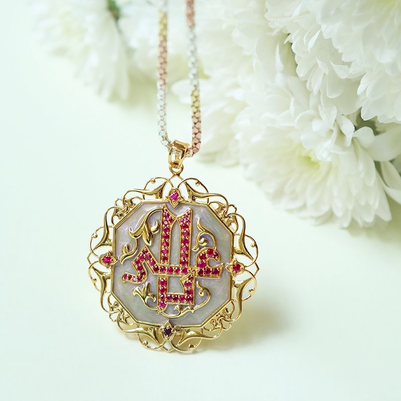 The Roohaniyat Taweez is an extraordinary piece filled with spiritual and divine powers from our signature collection. The attention to detail and intricacy of the design are what make this an exemplary piece that can be adorned for years. Ya Ali is studded with 57 Burma Rubies.