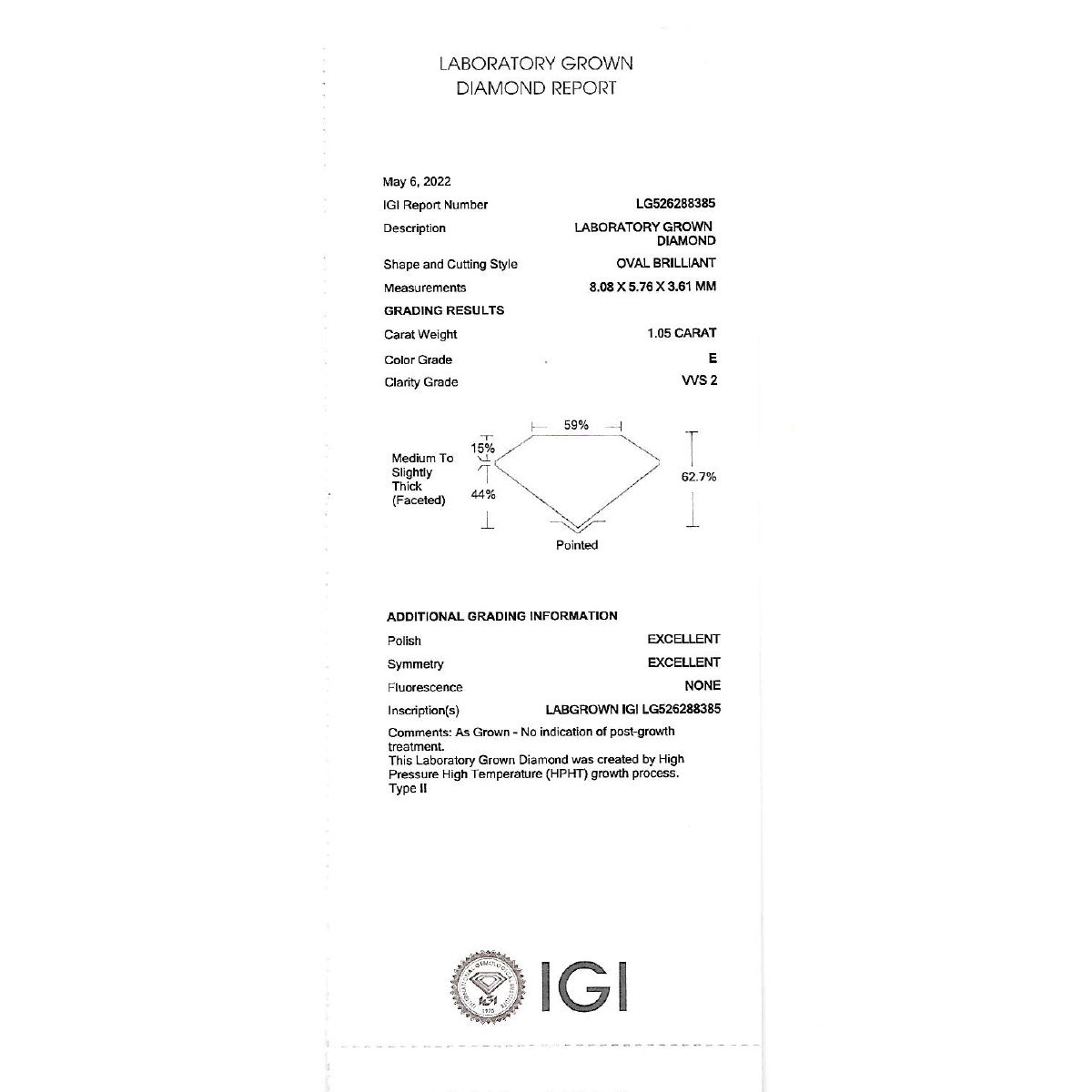 - Stone: Oval Solitaire 1pcs, 1.05 cts , VVS2 / E